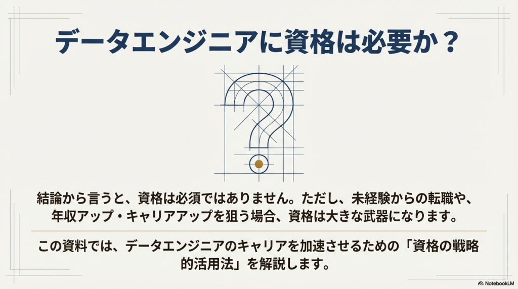 「データエンジニアに資格は必要?」「キャリアアップにつながるの?」 データエンジニアを目指す人の多くが悩むのが「資格は必要なのか?」という点でしょう。結論から言うと、資格は必須ではありません。ただし、未経験からの転職や、年収アップ・キャリ... -